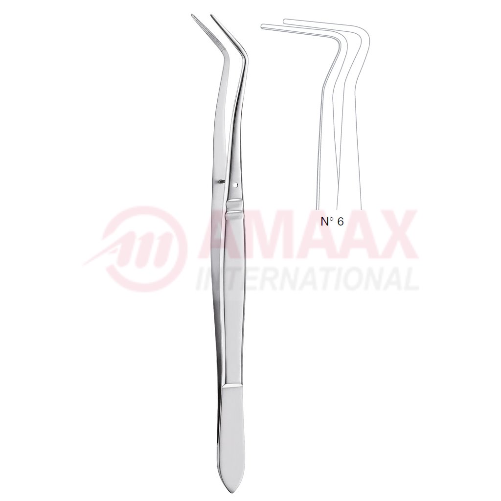 Meriam Dental Tweezer Fig.6, 16cm (6 1/4″), Angled, Smooth Handle With Recess